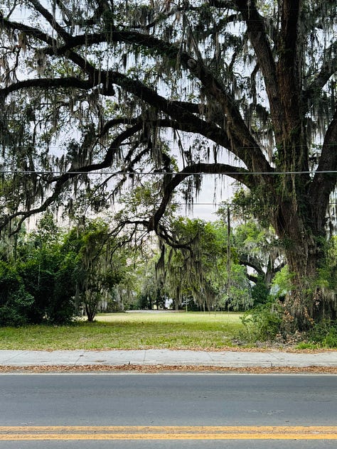 The beautiful, massive oak trees in Ocala, Florida, with Spanish moss dangling from their branches.