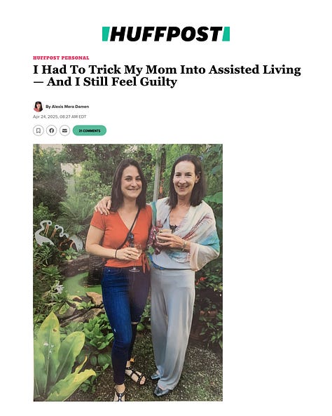 Setting and reaching small goals. My first-ever published personal essay (well, published via a large platform) is now live on HuffPost! OMG. Yayyyy. Shiiiiit. Yayyyy. Shiiiiit. Yayyyy. < That’s how I feel right now. Haha. It’s both exhilerating and scary as fuck to put myself out there. I wrote about tricking my mom into moving to assisted living after her Alzheimer’s diagnosis and our journey together from her home in Pennsylvania to her new “cozy winter condo” in Florida. I’ve been blown away by the dozens of emails and DMs I’ve received from readers, sharing their stories and thanking me for sharing mine. That’s the real win. Feel free to ask me anything about my experience with the long goodbye or about my experience writing and pitching personal essays in the comments of this post. Happy to share!