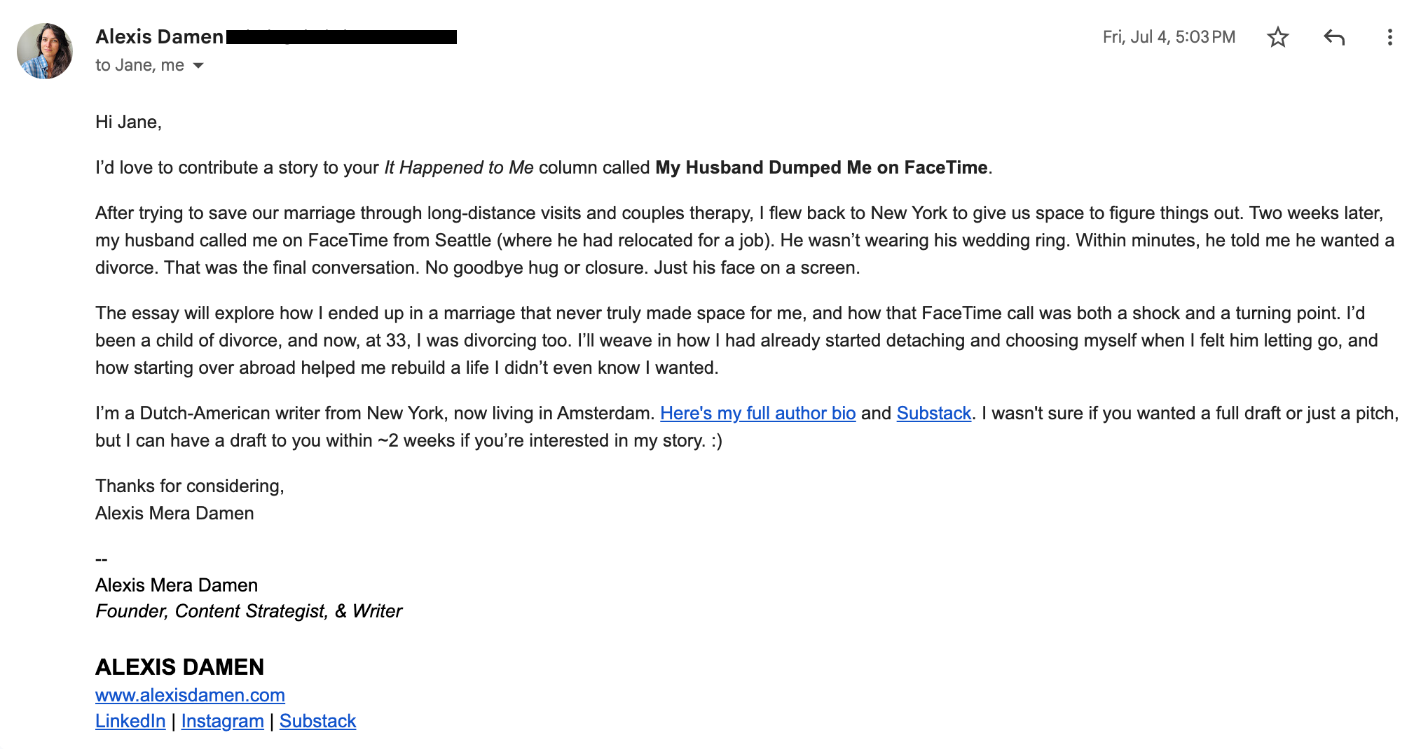 Tip 1: Study the titles of essays already published on the website you’re targeting to come up with a compelling title for your essay. Include your title in the subject line of the email submission. This subject: “My Husband Dumped Me on FaceTime”, is much more likely to stand out in a crowded inbox than “essay submission” or another generic subject line, and it follows the same structure and tone as existing stories on Another Jane Pratt Thing, where my essay was accepted and published.