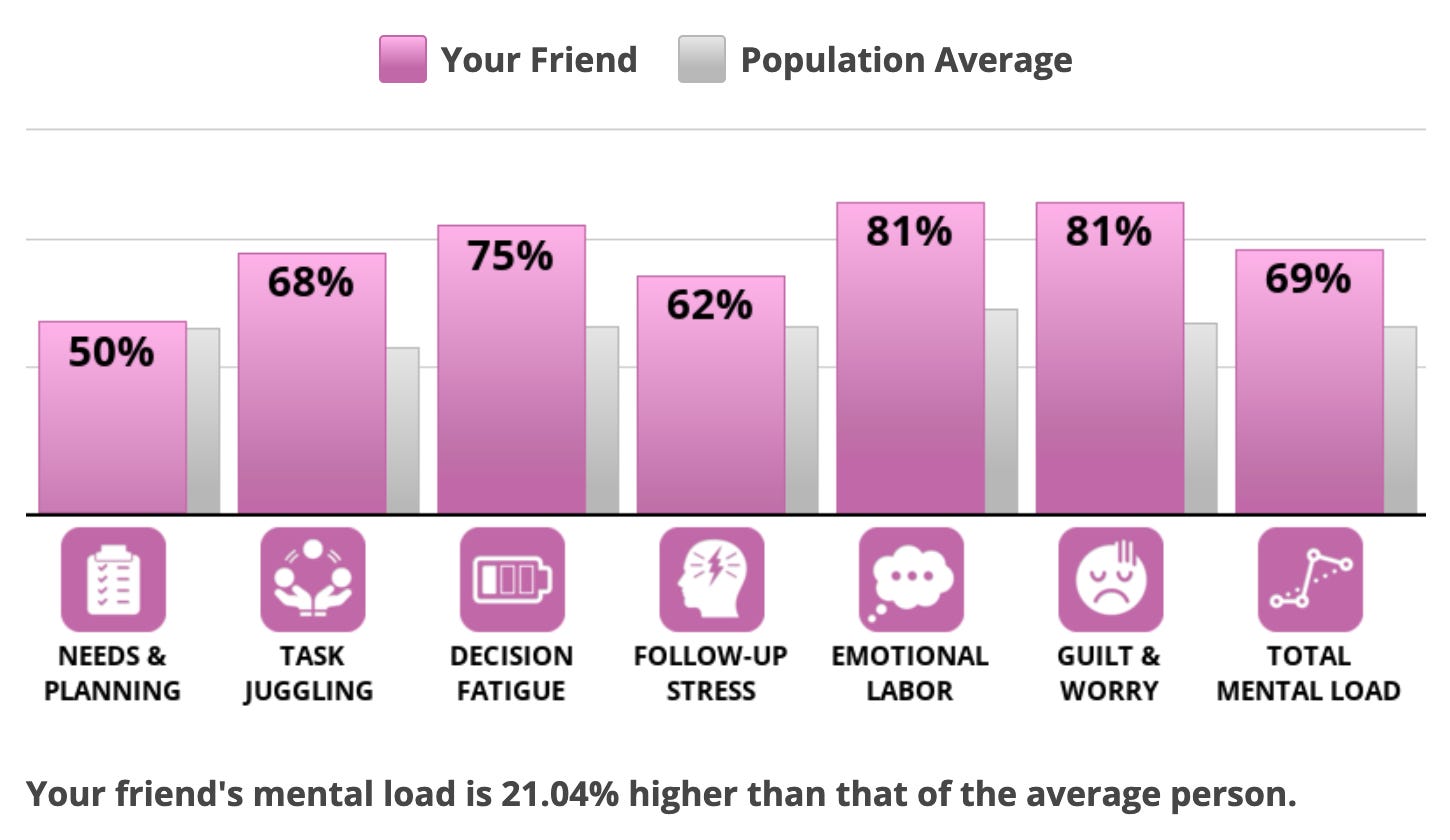 I took a 24-question mental load quiz that I found online to validate what I already knew. It was simple—just rate how much you agree with statements about your day-to-day responsibilities. I took it with a grain of salt, of course. Still, I scored 21% higher than average. The quiz didn’t ask for my age or personal context, but even so, the results made me pause.