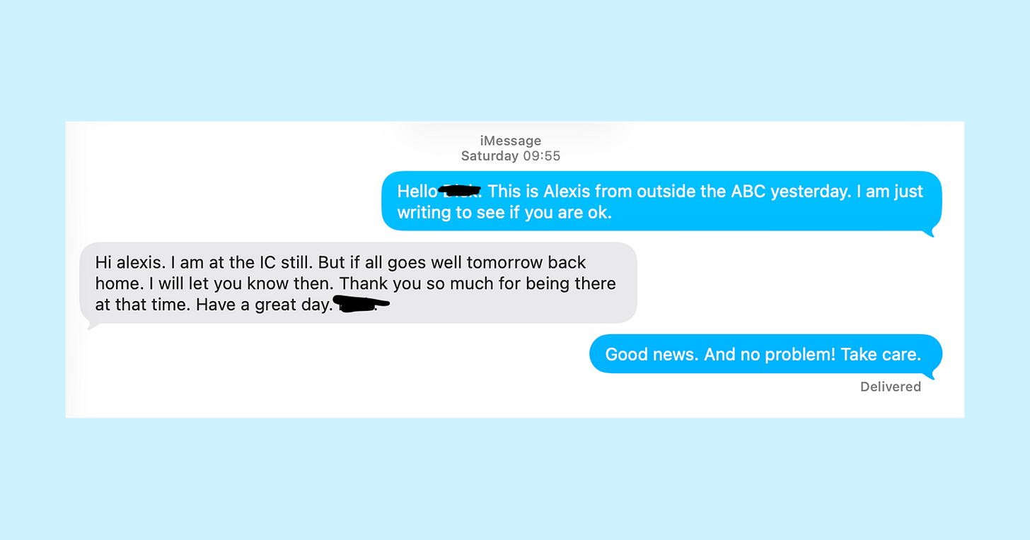 The next morning, I couldn’t stop thinking about the man in front of the bookstore. I wondered if he was OK, so I sent him an SMS.